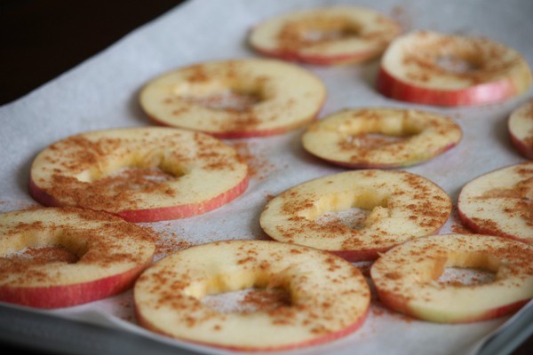 - Line a cookie sheet with parchment paper and place apple slices on it.