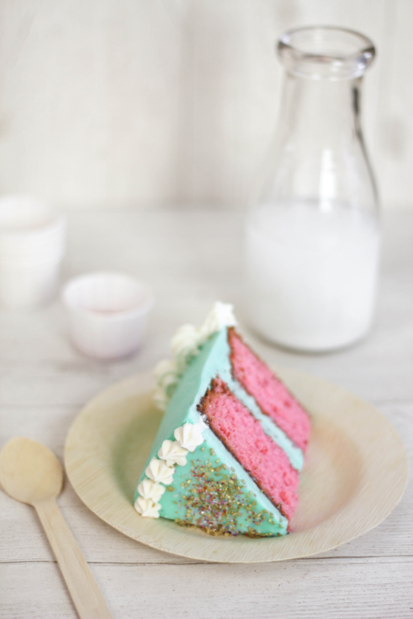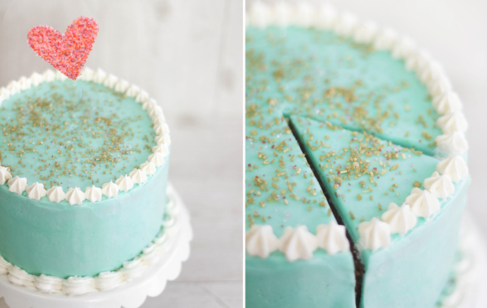 - Add the vanilla extract. Divide batter and tint with food coloring, if desired. I kept a little un-tinted frosting out to pipe around the edges of the cake. To achieve my favoriteblue/green tint, I used a dot each of Sky Blue and Kelly Green Wilton gel food colorings.