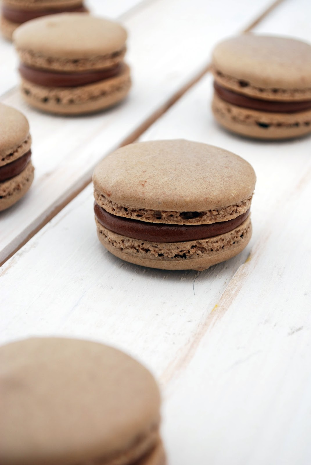 Place chocolate and Nutella in a medium sized heat-proof bowl. In a small saucepan, bring heavy cream to a simmer. Pour hot cream over the chocolate and Nutella and let sit for 20 seconds. Stir to combine until smooth. Place ganache in the refrigerator until thickened, but still pourable. Make sure to stir a few times during the process so the ganache is a uniform consistency throughout. Using an electric mixer, whip ganache until it is a pipeable consistency and light in color. Place ganache into a piping bag and pipe a small circle onto one macaron shell. Top it with a similar sized shell and squeeze together carefully.