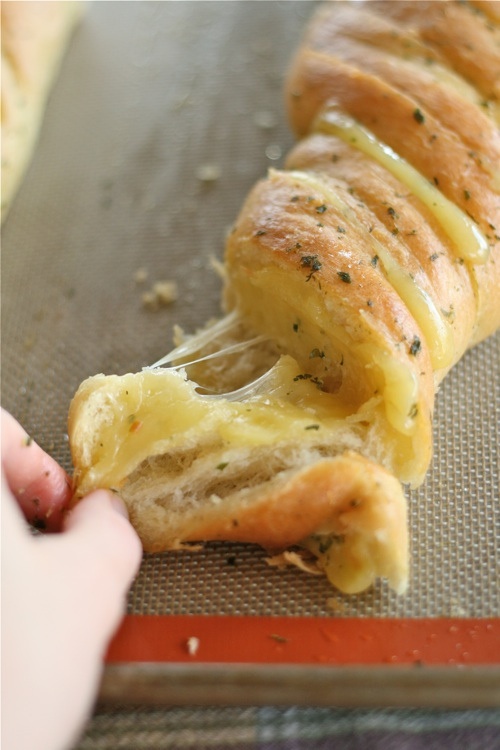 Cut 1-inch slices 3/4′s of the the way through the loaves. Brush garlic butter in between each slice and fill with a slice of cheese. Bake another 3-5 minutes or until cheese is completely melted.