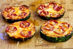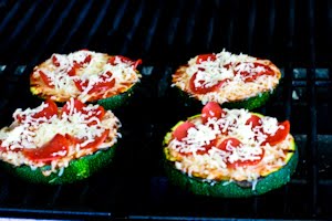 Cut zucchini into thick slices about 3/4 inch thick. (I used 8-Ball zucchini, which made lovely round slices, but you can cut the zucchini into round slices or lengthwise slices, depending on what shape the zucchini is. I wouldn’t use enormous zucchini with large seeds for this recipe.)Grill the zucchini 7-8 minutes, or until there are some grill marks and it’s starting to be tender. (If the zucchini has a side that’s slightly larger, grill that first so it will be the “top.”) If desired, you can heat the sauce while the zucchini grills. (I did, but next time I might not bother.)Remove zucchini from the grill, putting them grilled-side up on a cutting board you can use to take them to the kitchen. Add sauce, cheese, and other toppings as desired. (I spread each slice of zucchini with about 1 T red pizza sauce, then sprinkled each piece with a generous pinch of pizza cheese, added 4-5 slices of turkey pepperoni, and sprinkled over a tiny bit more cheese.)Put loaded zucchini slices back on the grill and cook 7-8 minutes more with the grill lid closed. (Check them every few minutes to see when the cheese is melted and the toppings are lightly browned, especially if you’re using a broiler. If you have a gas grill where you can regulate the heat, I turned it to high when I put the pizza back on.)
