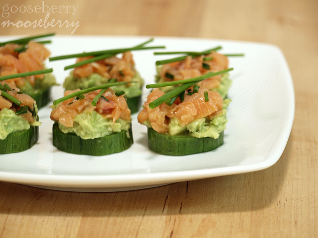 In a bowl, combine smoked salmon, soy sauce and lemon juice. Let stand for a minute, then mix in sesame oil and chives. Adjust ingredients to taste, as suitable for your own palate. To assemble, place cucumber slices on a serving platter and spread a small amount of the mashed avocado on each slice, enough to cover it. Carefully spoon the salmon tartare on top of each slice. Top with chive stalks for garnish. Serve or refrigerate up to one hour until serving.