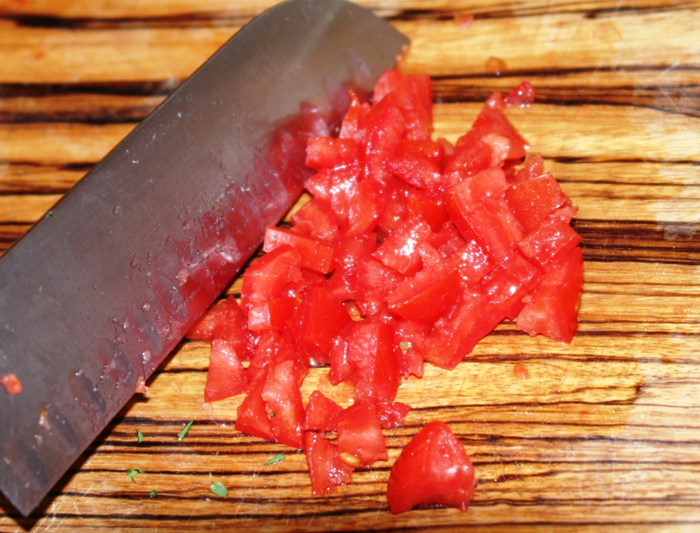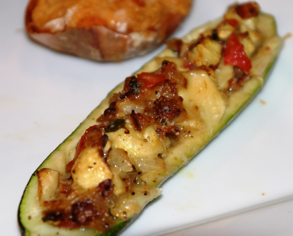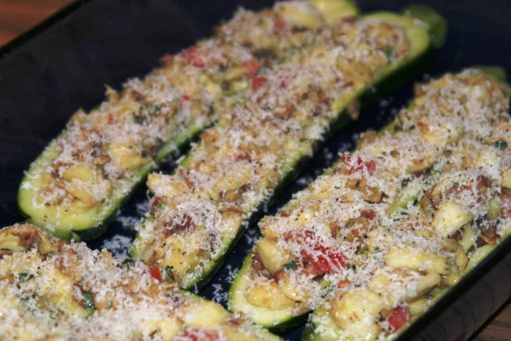 Stir in the tomatoes. Seed them or else there may be too much moisture in the filling. You don’t really want the filling to be all runny when you cut into it. Refill the zucchini shells with the filling mixture.