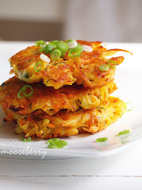 1. Peel and grate potatoes and yam and place in a bowl. Add the egg, dill, salt and pepper and mix. Sprinkle with potato flour and mix well to combine. Form the potato mixture into eight flattened patties (about 3 inches across). Heat oil on medium heat in a large pan and add the cakes, working in batches if necessary. Cook the cakes until golden brown, about 4 minutes per side. As an option, serve with chopped scallion and sour cream or low-fat plain yogurt.